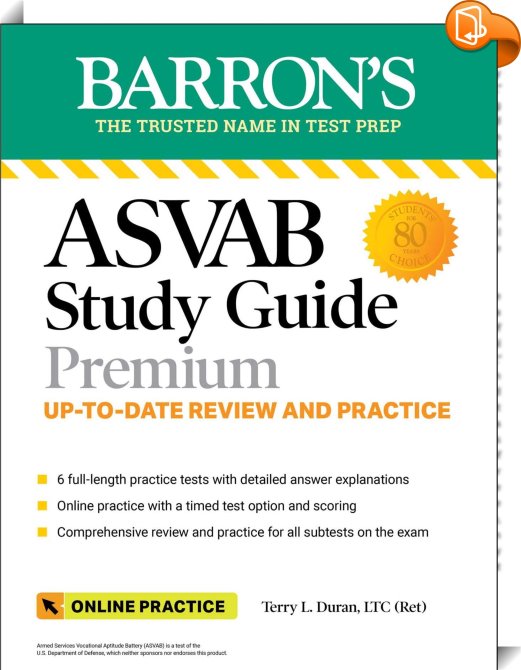 ASVAB Study Guide Premium: 6 Practice Tests + Comprehensive Review + Online Practice, , Barrons Educational Services, Terry L. Duran,Educational: Study and revision guides,Educational material, ASVAB test;ASVAB study guide;ASVAB prep;Army;Navy;Air Force;Marines;Coast Guard;Military test;Test preparation;Military;Armed Forces;Armed Forces Test;AFQT;Vocational Tests;Professional;Higher & Continuing Education;Armed Services Vocational Aptitude Battery;Military Career;enlist;military jobs;U.S. Armed Forces careers;Military Sciences;Army Careers;Navy Careers;Air Force Careers;Marines Careers;Coast Guard Careers,, Barron's Test Prep, United States, en-UShttps://www.barronseduc.comASVAB test;ASVAB study guide;ASVAB prep;Army;Navy;Air Force;Marines;Coast Guard;Military test;Test preparation;Military;Armed Forces;Armed Forces Test;AFQT;Vocational Tests;Professional;Higher & Continuing Education;Armed Services Vocational Aptitude Battery;Military Career;enlist;military jobs;U.S. Armed Forces careers;Military Sciences;Army Careers;Navy Careers;Air Force Careers;Marines Careers;Coast Guard Careers, [BLURB],[CITY],New York,books, ebooks, biblet, Book2look