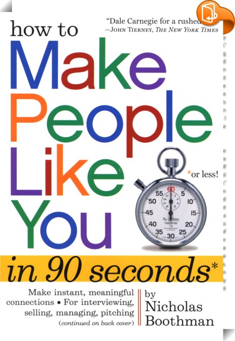 How to Make People Like You in 90 Seconds or Less, , Workman Publishing Company, Nicholas Boothman,Assertiveness, motivation, self-esteem and positive mental attitude,Popular psychology, neurolinguistic programming;NLP;personal connection;body language;social skills;likeable;persuasive;negotiating;planning;collaborating;rapport;synchrony;cues;corporate training;professional development;personal growth;handbook;sales;gaining clients;selling;convincing;understanding people;making friends;business;communication;personal;professional;skills;easy,, , United States, en-UShttps://www.hachettebookgroup.comneurolinguistic programming;NLP;personal connection;body language;social skills;likeable;persuasive;negotiating;planning;collaborating;rapport;synchrony;cues;corporate training;professional development;personal growth;handbook;sales;gaining clients;selling;convincing;understanding people;making friends;business;communication;personal;professional;skills;easy, [BLURB],[CITY],New York,books, ebooks, biblet, Book2look