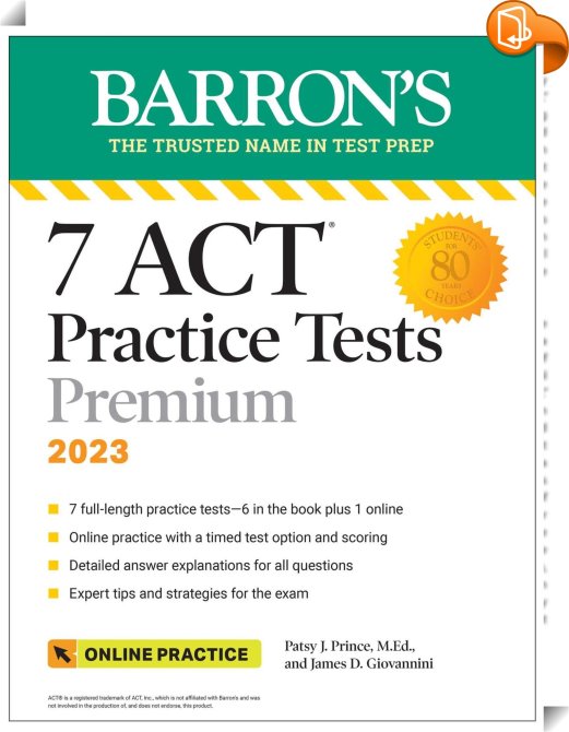 7 ACT Practice Tests Premium, 2023 + Online Practice, , Barrons Educational Services, James D. Giovannini, Patsy J. Prince,Educational: Study and revision guides,Educational material, ACT practice;ACT exam;ACT test;ACT prep;ACT test preparation;ACT English;ACT math;ACT mathematics;ACT reading;ACT science;ACT writing;ACT practice exams,, Barron's Test Prep, United States, en-UShttps://www.barronseduc.comACT practice;ACT exam;ACT test;ACT prep;ACT test preparation;ACT English;ACT math;ACT mathematics;ACT reading;ACT science;ACT writing;ACT practice exams, [BLURB],[CITY],New York,books, ebooks, biblet, Book2look