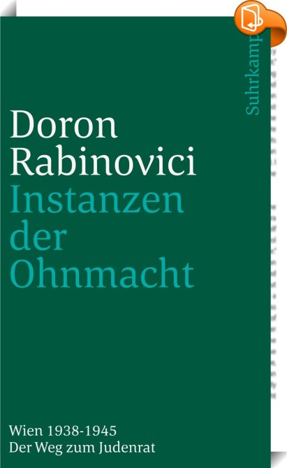 Instanzen der Ohnmacht, Wien 1938-1945. Der Weg zum Judenrat, Jüdischer Verlag, Doron Rabinovici,Europäische Geschichte,Geschichte, Anton-Wildgans-Preis 2011, Deutschland, Ehrenpreis für Toleranz in Denken und Handeln 2015, Europa, Geschichte 1938-1945, Internationaler Tag des Gedenkens an die Opfer des Holocaust, Israelitische Kultusgemeinde Wien, Judenverfolgung, Mitteleuropa, Österreich, Österreichisches Ehrenkreuz für Wissenschaft und Kunst 2022, Taschenbuch,, , Germany, de-DEhttps://www.suhrkamp.de?utm_source=leseprobe&utm_medium=logo&utm_campaign=book2lookAnton-Wildgans-Preis 2011, Deutschland, Ehrenpreis für Toleranz in Denken und Handeln 2015, Europa, Geschichte 1938-1945, Internationaler Tag des Gedenkens an die Opfer des Holocaust, Israelitische Kultusgemeinde Wien, Judenverfolgung, Mitteleuropa, Österreich, Österreichisches Ehrenkreuz für Wissenschaft und Kunst 2022, Taschenbuch, [BLURB],[CITY],,books, ebooks, biblet, Book2look
