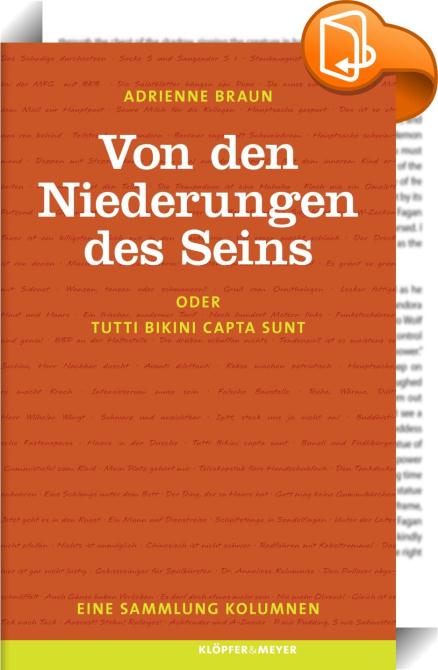 Von den Niederungen des Seins oder Tutti bikini capta sunt , Eine Sammlung Kolumnen, Klöpfer&Meyer Verlag, Adrienne Braun,Moderne und zeitgenössische Belletristik: allgemein und literarisch,Belletristik: allgemein und literarisch, nicht nach Genre, Kolumnen, Phrasen, Marotten,, , Germany, de-DEhttp://www.kloepfer-meyer.de/Kolumnen, Phrasen, Marotten, [BLURB],[CITY],,books, ebooks, biblet, Book2look