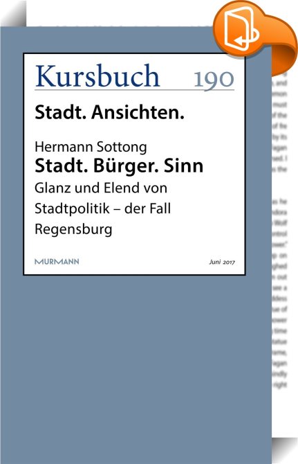 Stadt. Bürger. Sinn, Glanz und Elend von Stadtpolitik - der Fall Regensburg, Kursbuch, Hermann Sottong,Gesellschaft und Sozialwissenschaften,, Bürgerbeteiligung, bürgerschaftliches Engagement, Empowerment, Kursbuch 190, Mitbestimmung, Mitgestaltung, Regensburg, Städteplanung, Stadtkonzept, Stadtverwaltung, Urbanisierung,, , Germany, de-DEhttps://www.book2look.comBürgerbeteiligung, bürgerschaftliches Engagement, Empowerment, Kursbuch 190, Mitbestimmung, Mitgestaltung, Regensburg, Städteplanung, Stadtkonzept, Stadtverwaltung, Urbanisierung, [BLURB],[CITY],,books, ebooks, biblet, Book2look